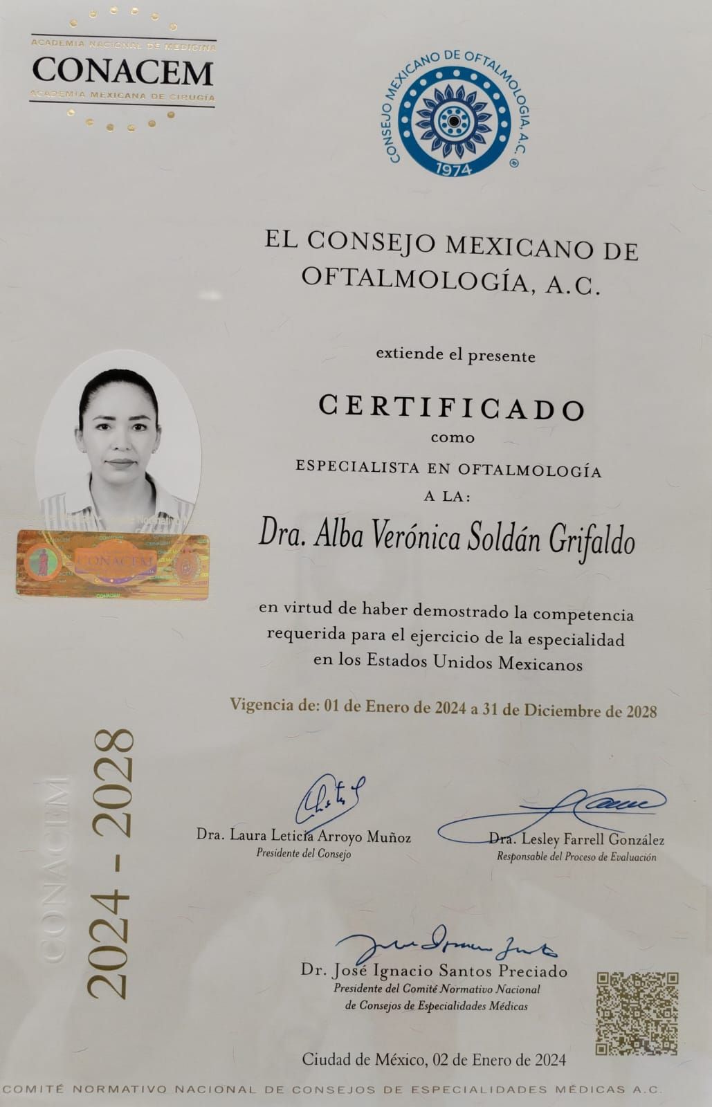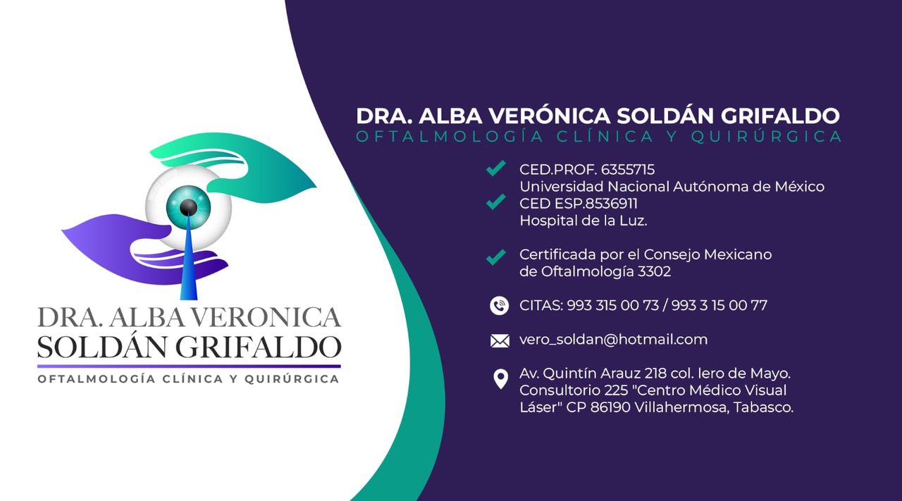 Soy la Dra. Alba Veronica Soldán Grifaldo, estudie la carrera de medicina en la UNAM y realice mi especialidad en oftalmología en el HOSPITAL DE LA LUZ en CDMX, avalada como medico especialista en oftalmología por la UNAM y certificada por el consejo mexicano de oftalmología. Laboro como cirujano oftalmólogo desde febrero 2014, valoro pacientes de todas las edades (0 a 100 años) ofreciendo diagnostico y tratamiento medico-quirúrgico a cualquier tipo de padecimiento en sus ojos.